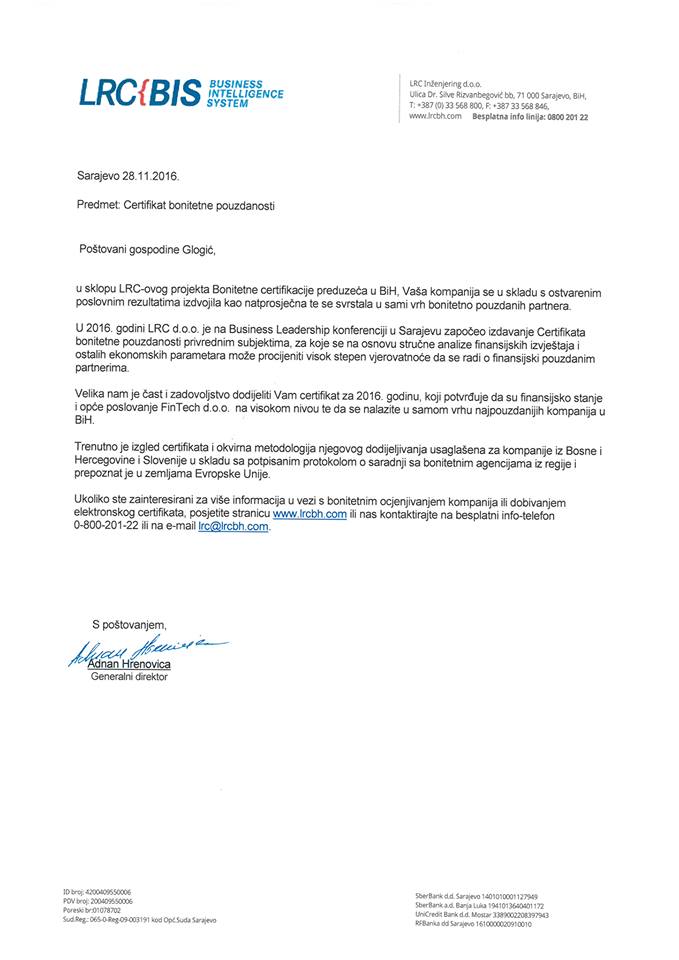 U sklopu LRC-ovog projekta Bonitetne certifikacije preduzeća u BiH, kalesijska kompanija FINTECH se u skladu sa poslovnim rezultatima izdvojila kao natprosječna, te je svrstana u sami vrh bonitetno poudaznih partnera.