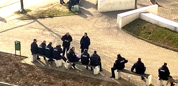 14.35h – U centru Kalesije mirno. Policija odmara na klupama ispred zgrade Općine.