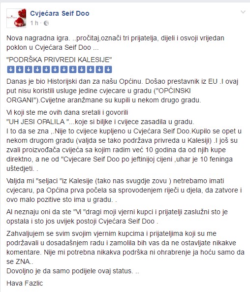 - Komentar, koji je objavila na Facebook stranici “Cvjećara Seif Doo”, uz odobrenje Have Fazlić, prenosimo u cjelosti i bez izmjena.
