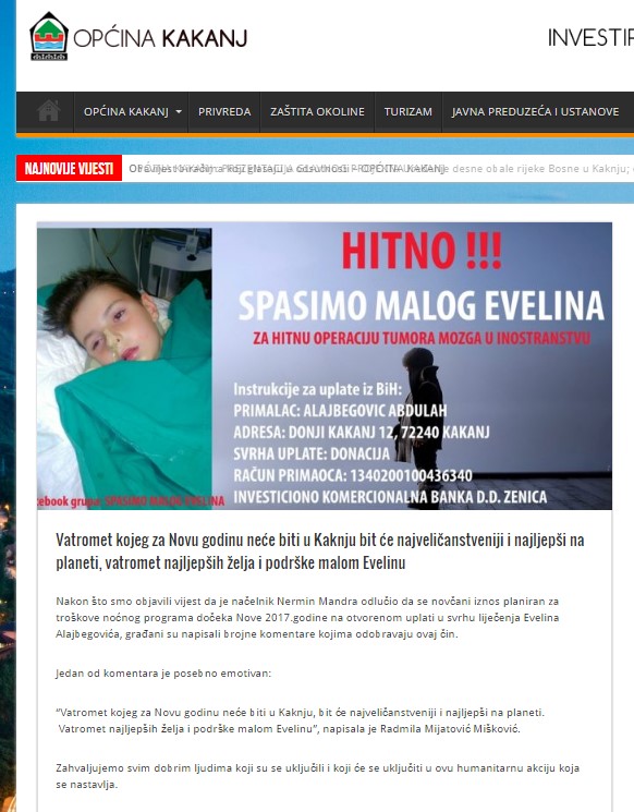 Shvatajući činjenicu da su hitno potrebna novčana sredstva za operaciju našeg sugrađanina sedmogodišnjeg dječaka Evelina Alajbegovića, uvažavajući stavove građana s kojima se konsultirao putem Facebook profila Općine Kakanj, načelnik Nermin Mandra je odlučio da se novčani iznos planiran za troškove noćnog programa dočeka Nove 2017. godine na otvorenom uplati u svrhu liječenja Evelina Alajbegovića te da se u okviru dočeka Nove godine organizira samo dnevni program namijenjen djeci.