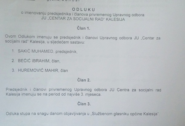 Tako je bilo i prilikom konstituirajuće sjednice UO CZSR Kalesija, kada su članovi odmah izvršili naređenja političkih stranaka, te smijenili v.d. (vršilac dužnosti) direktora ove ustanove, iako je Zakonom regulisano da na prvoj (konstituirajućoj) sjednici ne može doći do smjena i novih imenovanja.