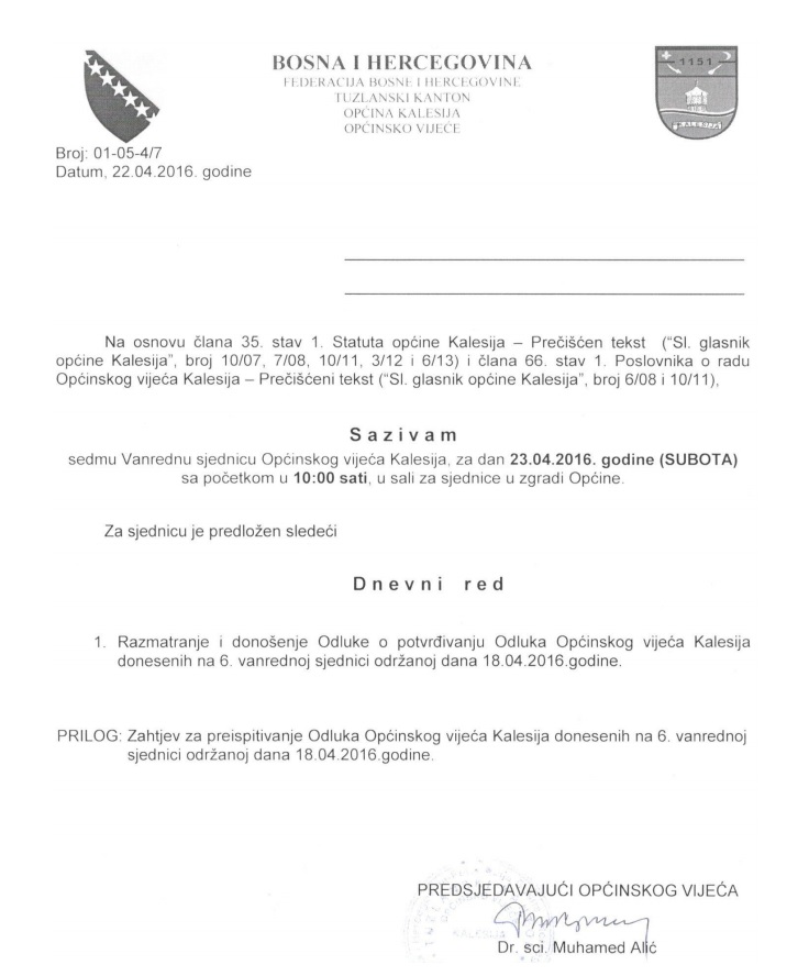 11:50 – završena je 7.vanredna sjednica Općinskog vijeća Kalesija.