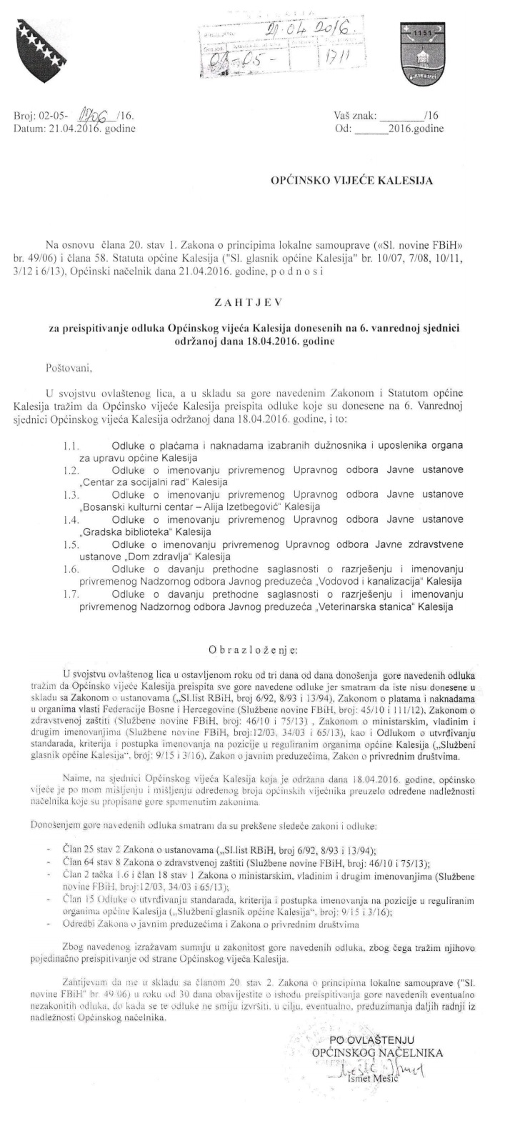 10:13 – Ismet Mešić, koji po ovlaštenju mijenja općinskog načelnika, obrazlaže razloge sazivanja sjednice vijeća na kojoj traži preispitivanje odluka donesenih na 6.vanrednoj sjednici održanoj 18.04.2016. godine. Mešić je kazao da smatra da odluke nisu donesene u skladu sa Zakonom o ustanovama, Zakonom o platama i naknadama, Zakonom o zdravstvenoj zaštiti, Zakonom o ministarskim, vladnimim i drugim imenovanjima i Odlukom o utvrđivanju standarda, kriterija o imenovanjima u Organ uprave općine Kalesija. Općinsko vijeće je, po njegovom mišljenju, preuzelo ovlasti općinskog načelnika.