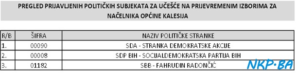 Već ranije je najavljeno da će SDA i SDP imati kandidata za dvogodišnji mandat načelnika Općine Kalesija. Pored ove dvije stranke, u Centralnu izbornu komisiju je stigla i prijava SBB Kalesija, koji će također imati svog kandidata za načelnika.