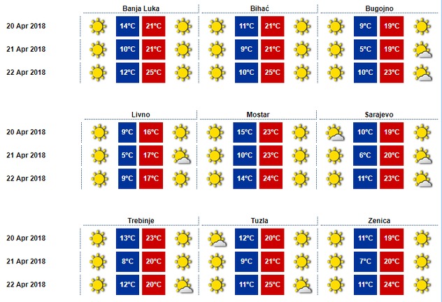 U Bosni i Hercegovini danas će preovladavati sunčano vrijeme uz malu do umjerenu oblačnost, s maksimalnom temperaturom do 23 stepena, a na jugu 27. Slično vrijeme očekuje nas i u petak, a oblaci će nestati već za vikend kada ćemo uživati u suncu i temperaturama do 27 stepeni.