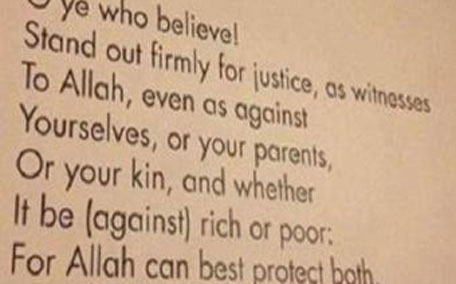 Ajet sure An-Nisa (Žene) objavljen je na zidu okrenutom ka glavnom ulazu, posvećenom najboljim citatima koji su izrečeni o pravdi, prenosi arapski dnevni list Ajel. Saudijski student koji studira na Harvardu objavio je fotografiju plakata na svom Twitter profilu.