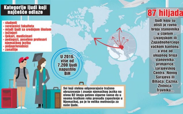 Hiljade ljudi, mahom mladih, nastavljaju odlaziti iz Bosne i Hercegovine! Mirhunisa Zukić, predsjednica Unije za održivi povratak i integracije u BiH, potvrdila je za “Dnevni avaz” da je, prema njihovim informacijama s terena, u 2016. više od 7.200 ljudi napustilo BiH, što, s ranijim podacima o broju onih koji su iz zemlje otišli u protekle dvije godine, doseže cifru od čak 87.000 ljudi!