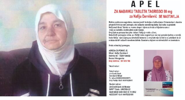 Molimo poštovane sugrađane, nosioce javnih funkcija u institucijama i firmama kao i vlasnike privatnih firmi da nam pomognu Narfiji Dervišević oko nabavke lijeka TAGRISSO 80 mg, koji našoj sugrađanki znači život. Tablete su veoma skupe i cijena se kreće u hiljadama eura a mora se koristiti u kontinuitetu svaki mjesec.