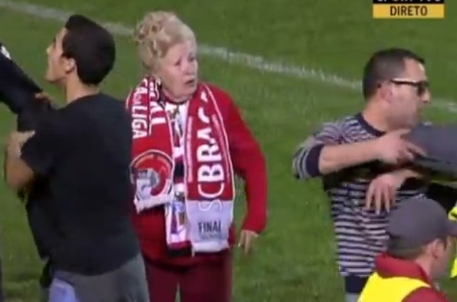 Nakon jednog prekida utakmice, na teren je ušla manja grupa navijača Brage. Što i nije neko iznenađenje. Ali, ono što je sve ostavilo bez teksta bila je i činjenica da je među njima bila i starija gospođa u bojama i šalu kluba