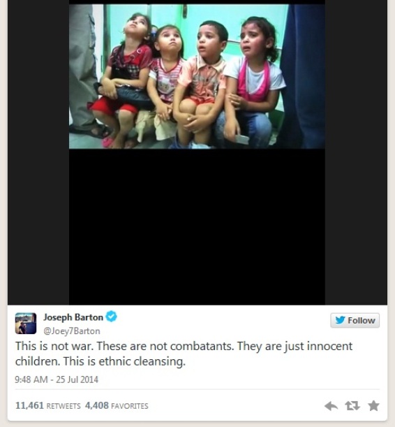 Englez je putem svog Twiter profila poslao nekoliko poruka u kojima poziva Izrael da prestane sa bombardovanjem kazavši da se ne radi o ratu nego etničkom čiščenju.