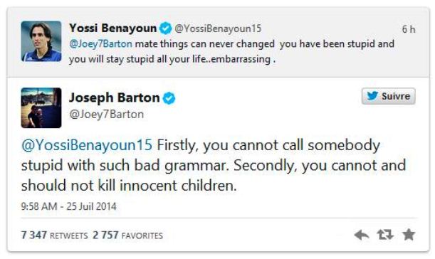 Uslijedila je reakcija Josepha Benayouna koji je poručio Bartonu sljedeće: ”Prijatelju, stvari se ne mogu nikad promijeniti, bio si glub i ostat ćeš glup čitavog života, sramotno”.