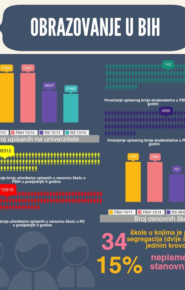 Vratimo li se na prethodni zaključak o značaju “ljudskog kapitala” za razvoj istraživanja i nauke, ni ono malo dostupnih podataka o obrazovanju u BiH ne daju povoda za optimizam. Ukupan broj upisanih studenata/ica u visokoškolske ustanove u FBiH u školskoj 2013/2014. godini iznosio je 72.601, što je samo neznatno više nego prethodne školske godine. Ukupan broj upisnih studenata u školsku 2012/2013. godinu iznosio je 72.460. U Republici Srpskoj je, pak, došlo do pada, te je u školskoj 2013/2014. godini upisano 41.988 novih studenata/ica, dok se, recimo, prije dvije godina na univerzitete upisalo 46.547 studenata/ica.