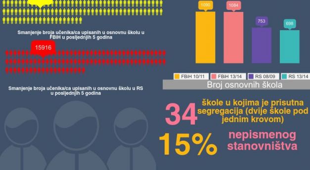 BiH se po prijemu u Vijeće Evrope 2002. godine obavezala da će ukinuti “dvije škole pod jednim krovom”. Međutim, to nije učinjeno ni 12 godina kasnije. Ovakav sistem obrazovanja još postoji u 34 odgojno – obrazovne ustanove. Prema UNESCO-vim istraživanjima iz 2012. godine, čak 15% stanovništva u BiH je nepismeno. Podaci za 2014. godinu još nisu objavljeni.