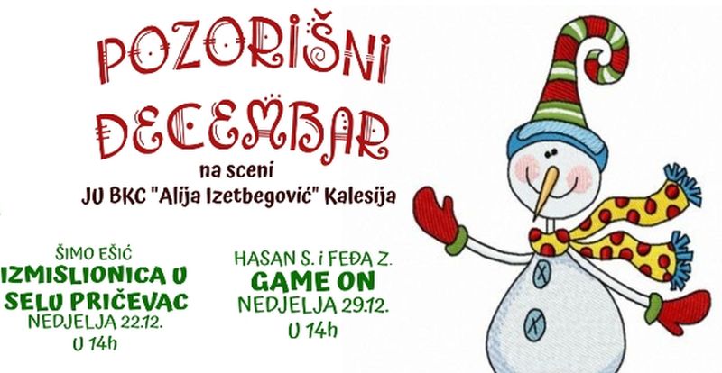 Predstave će se u Kalesiji igrati nedjeljom na sceni JU BKC “Alija Izetbegović” sa početkom od 14,00 sati, a ovo je repertoar “Pozorišnog decembra”: