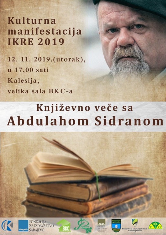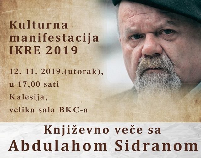 U okviru programa Kulturne manifestacije „IKRE 2019“, u utorak, 12. novembra, sa početkom u 17,00 sati, u velikoj sali kalesijskog BKC-a, održat će se Književno veče sa Abdulahom Sidranom.