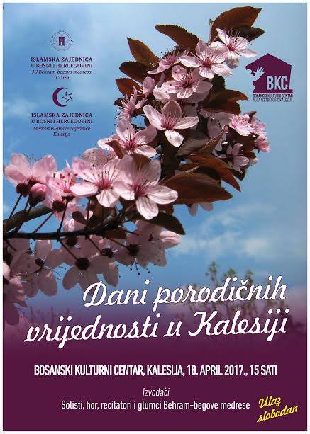 U utorak, 18. aprila, sa početkom u 15,00 sati, u sali Javne ustanove BKC „Alija Izetbegović“ Kalesija, održat će se manifestacija „Dani porodičnih vrijednosti“. Program će izvesti učenici Behram-begove medrese u Tuzli. Ovom tradicionalnom manifestacijom želi se ukazati na trajne vrijednosti porodice. Publika će imati priliku da uživa u kolažnom programu satkanom od ilahija, kasida, recitala, dramskih predstava…
