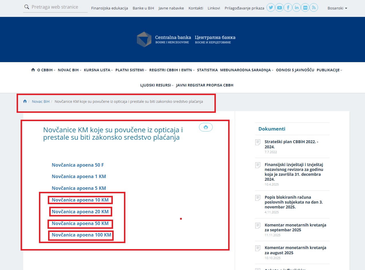 - Sve informacije o novčanicama koje su povučene iz opticaja dostupne su na zvaničnoj stranici www.cbbh.ba u kategoriji Novčanice KM koje su povučene iz opticaja.