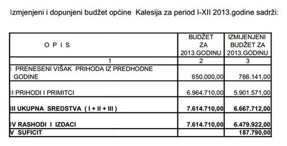 Rebalansirani budžet općine Kalesija, ukoliko dođe do usvajanja, iznosit će 6.479 922 KM, što je za milion i 134 hiljade maraka manje u odnosu na usvojeni budžet općine Kalesija za 2013. godinu, koji je iznosio 7. 614 710 KM.