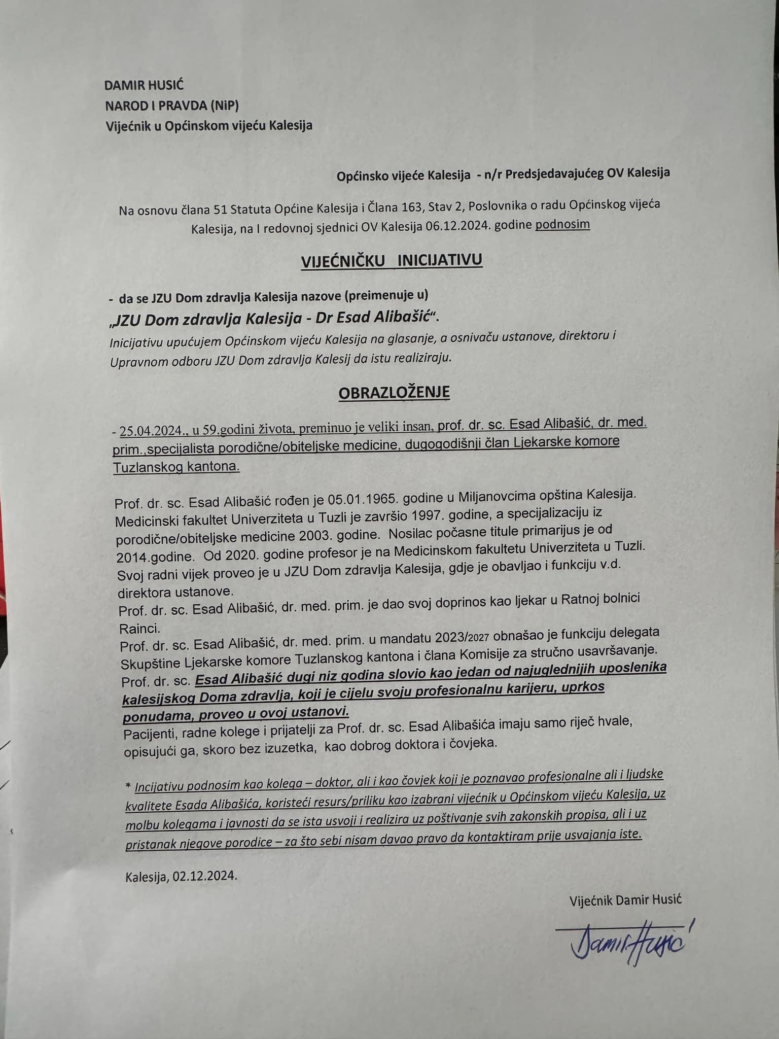 * Incijativu podnosim kao kolega – doktor, ali i kao čovjek koji je poznavao profesionalne ali i ljudske kvalitete Esada Alibašića, koristeći resurs/priliku kao izabrani vijećnik u Općinskom vijeću Kalesija, uz molbu kolegama i javnosti da se ista usvoji i realizira uz poštivanje svih zakonskih propisa, ali i uz pristanak njegove porodice – za što sebi nisam davao pravo da kontaktiram prije usvajanja iste.”