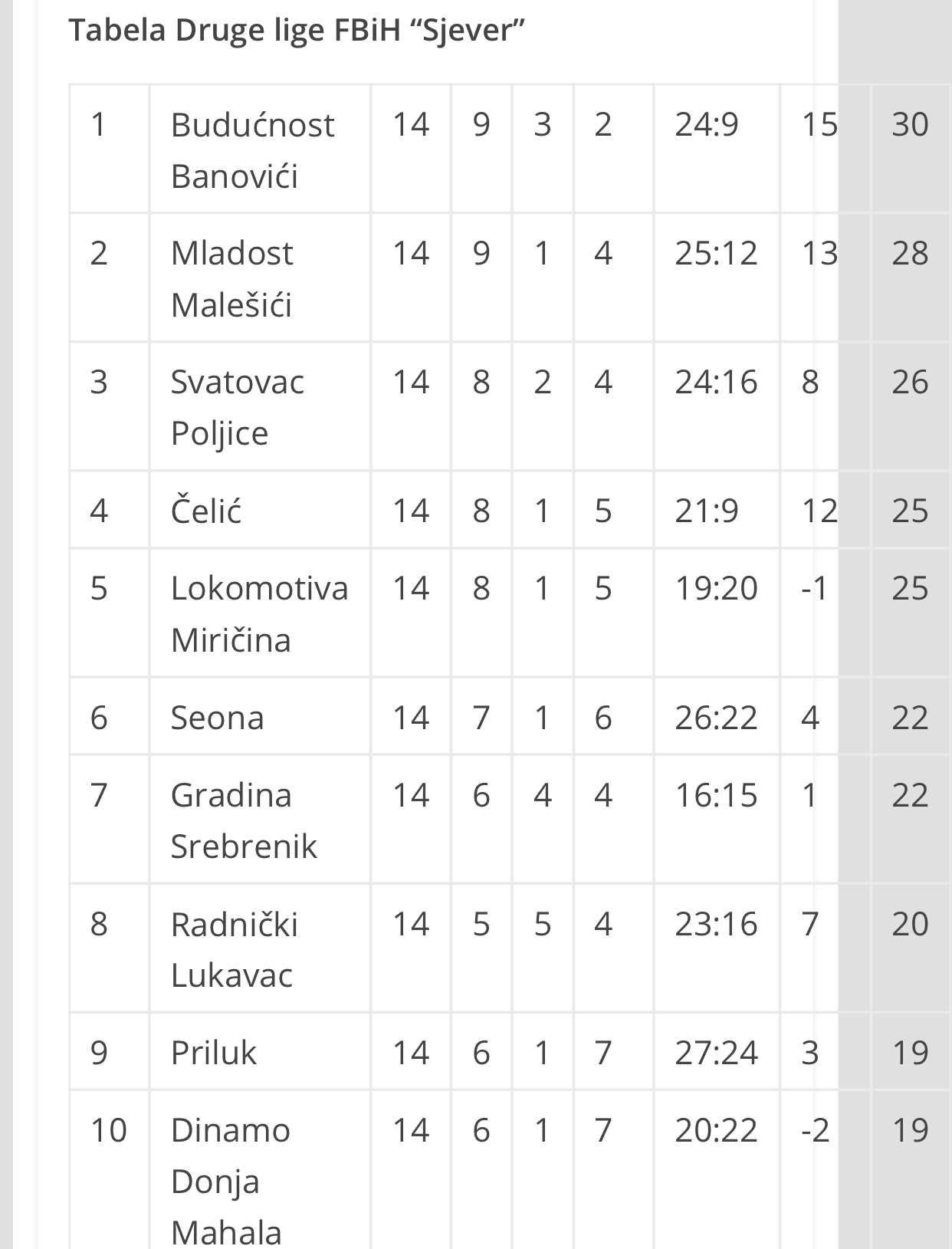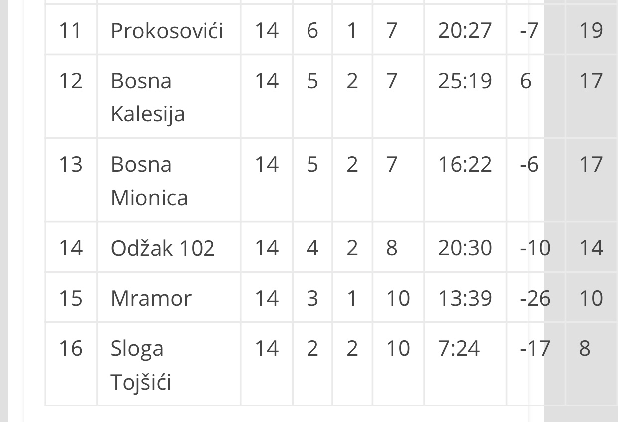 Fudbaleri kalesijske Bosne u posljednjem prvenstvenom nastupu pred zimsku pauzu gostovat će kod Priluka. Kolo prije kraja prvog dijela prvenstva Bosna iz Kalesije je dvanaesta na tabeli sa 17 bodova, dok je Sloga iz Tojšića na posljednjem šesnaestom mjestu sa 8 bodova.