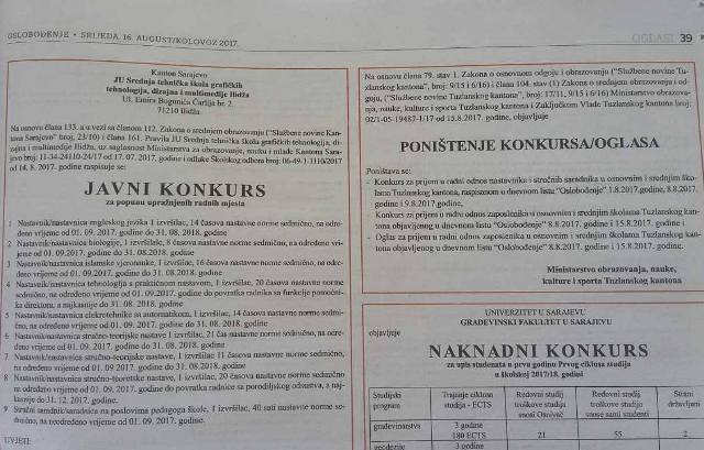 Danas su poništeni konkursi i oglasi za prijem uposlenika u škole u TK i objavljen novi konkurs, saopćeno je iz Ministarstva obrazovanja, nauke, kulture i sporta Tuzlanskog kantona.