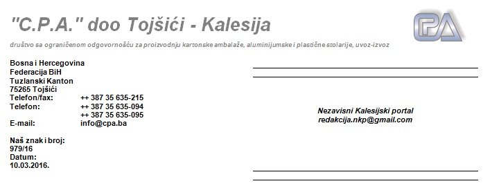 U cilju istinitog  informisanja javnosti, a povodom brojnih dešavanja koja su aktuelna ovih dana, C.P.A. d.o.o. Tojšići osjeća obavezu da javno demantuje neke navode iznesene od strane Nezavisnog Kalesijskog portala  dana 08.02.2016 godine, tačnije u objavljenom pismu Predstavnika građana Mjesne zajednice Tojšići Džambić Hazima, a  u kojem isti iznosi netačne, neprovjerene i nedokazane navode od kojih je jedna „da Društvo C.P.A. d.o.o. Tojšići svojim emisijama iz kotlova ugrožava zdravlje građana“.