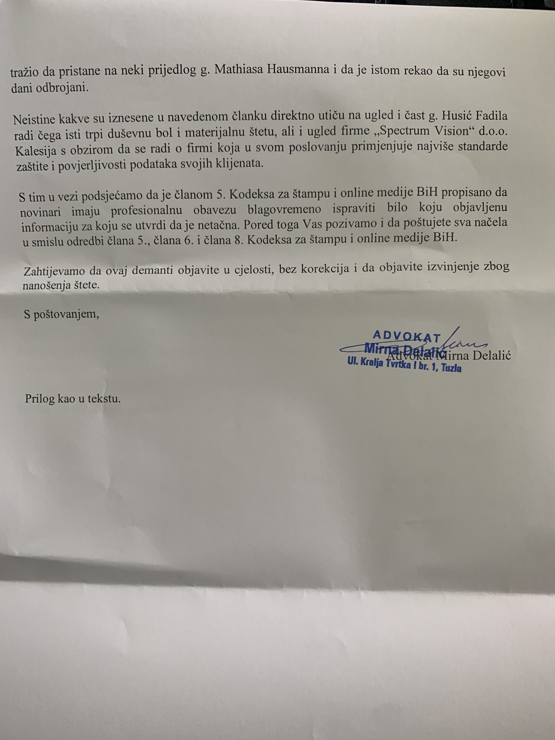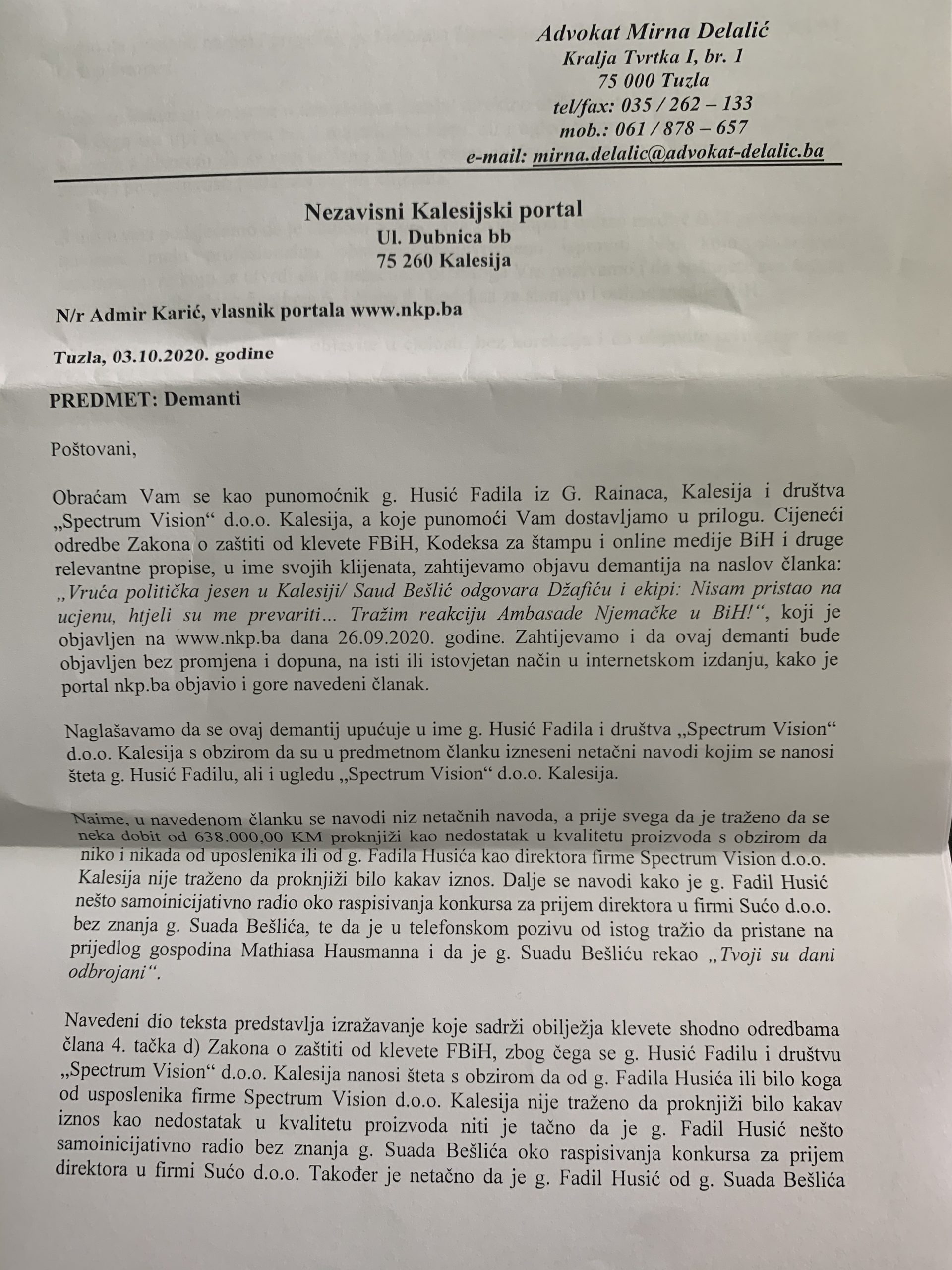 Putem pošte je stigao novi demantij od strane advokata ovlaštenih od strane Fadila Husića, na tekst vijesti koji je NKP 26.09.2020. preuzeo sa portala depo.ba.