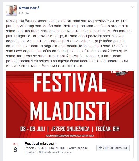 - “Neka je na čast i sramotu onima koji su zakazali ovaj “festival” za 08. I 09. juli, tj. prvi i drugi dan Marša mira. Nek’ im je na sramotu što to organizuju samo nekoliko kilometara daleko od Nezuka, mjesta polaska Marša mira 08. jula. Drugarice i drugovi iz Kalesije, mi smo dobili poziv također za ovaj događaj. Ja Vas molim da bojkotujete! U ovo vrijeme, prije tačno godinu dana, smo se borili da odgodimo sramotnu koridu i uspjeli smo. Pokušao sam i ovo odgoditi, ali očito da nemaju sluha. Očito da se oni žrtava sjete samo kad treba se slikati ili ‘pak položiti cvijeće. Također, u narednom periodu podnijet ću ostavku na mjesto člana koordinacionog odbora FOM KO SDP BiH Tuzla te člana KO SDP BiH Tuzla.”