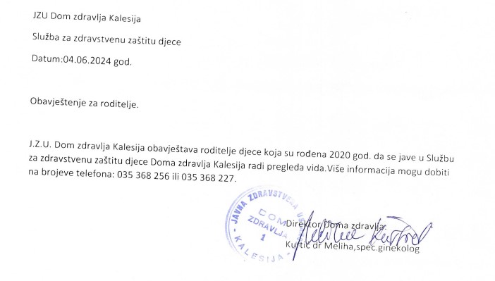 • JZU Dom zdravlja Kalesija obavještava roditelje djece koja su rođena 2020. godine da se jave u Službu za zdravstvenu žastitu djece Doma zdravlja Kalesija radi pregleda vida.