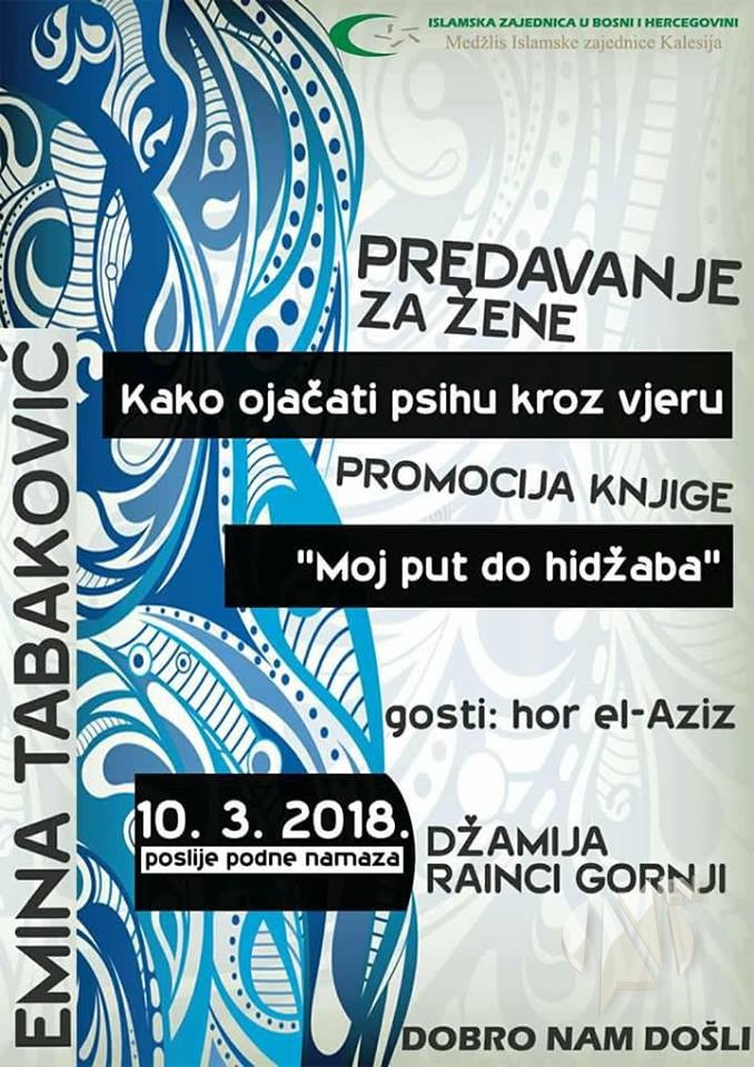 U subotu, 10.marta 2018. godine, poslije podne-namaza u džematu Rainci Gornje, u džamiju, održat će se predavanje za žene “Kako ojačati psihu kroz vjeru” i i promocija knjige “Moj put do hidžaba”.