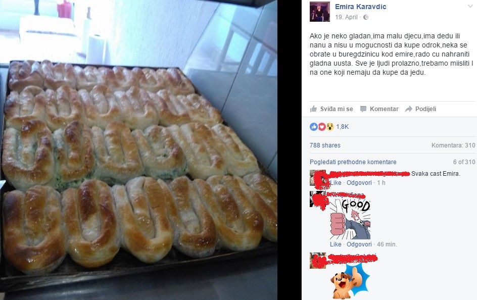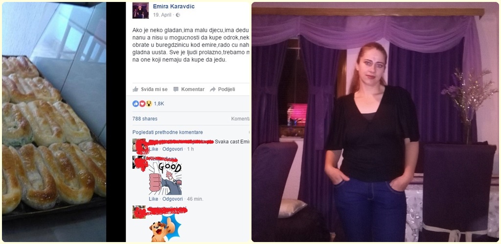 -Ako je neko gladan, ima malu djecu, ima dedu ili nanu, a nisu u mogućnosti da kupe obrok,neka se obrate u buregdžinicu kod Emire, rado ću nahraniti gladna uusta. Sve je ljudi prolazno,trebamo misliti i na one koji nemaju da kupe da jedu, napisala je Emira u svom statusu, nakon čega su uslijedili brojni pozitivni komentari građana BiH.