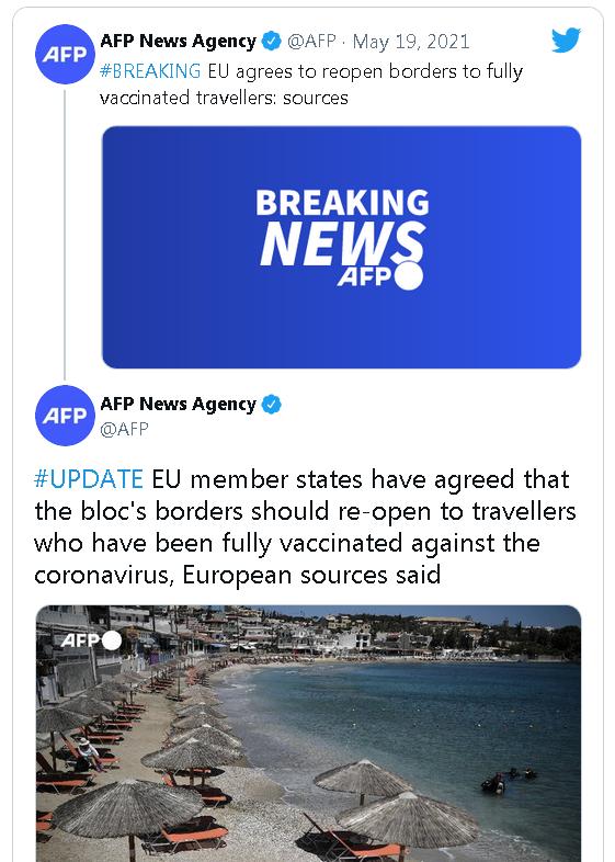 Zemlje članice Evropske unije danas su se složile da bi granice trebale biti otvorene za putnike koji su primili obje doze vakcine protiv koronavirusa, javlja AFP.