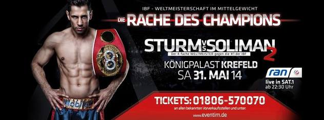 Svjetski šampion u srednjoj kategoriji Felix Sturm, pravog imena Adnan Ćatić, branit će ponovo svoju krunu protiv Sama Solimana 31. maja u KoenogPALAST-u u Krefeldu u Njemačkoj.
