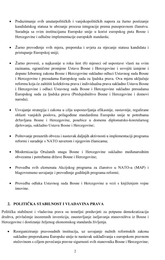 Na kraju se ističe da su stranke potpisnice usuglašene da će programske mjere zasnovane na smjernicama, načelima i ciljevima iz ovog dokumenta biti detaljno razrađene u razdoblju koje će prethoditi formiranju izvršne vlasti sukladno ustavnim nadležnostima.