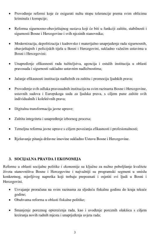 Također, navodi se povećanje penzija i plata, ubrzanje razvoja infrastrukture, implementacija okolišnih politika i razvoj turizma, reforme zdravstvenih politika, obrazovanja ali i reforma cjelokupnog RTV sistema BiH i FBiH u skladu s Ustavom.