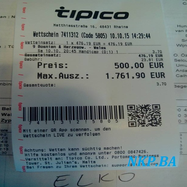 Elmir Imšić – Elko iz Kalesije, koji se trenutno nalazi u Njemačkoj, je u sportskoj kladionici uplatio 500 Eura na pobjedu Bosne i Hercegovine protiv Velsa.