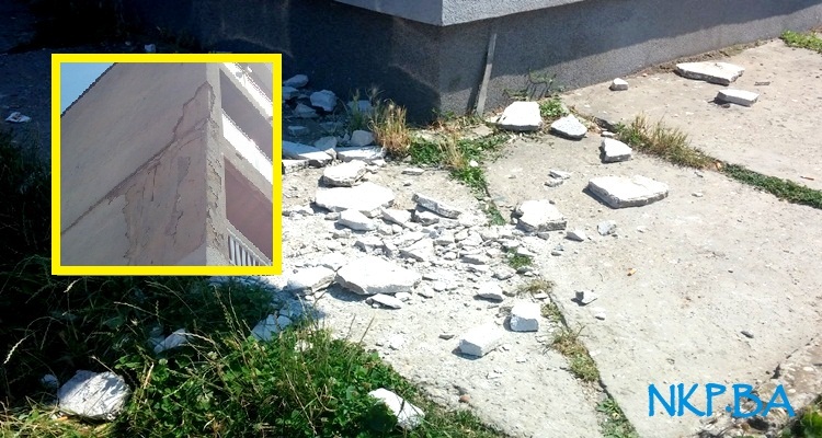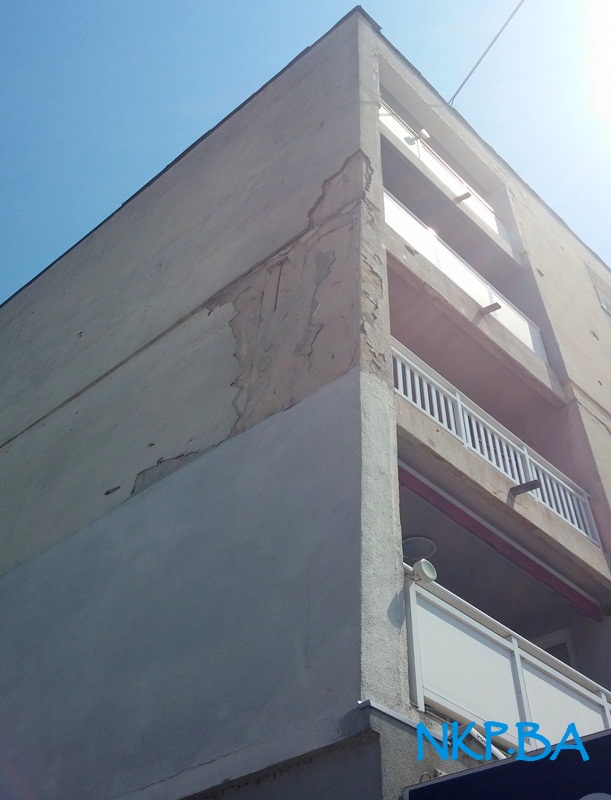 U ponedjeljak smo zabilježili fotografije obrušavanja većih komada maltera, težine i preko 1 kg, sa zgrade na drugoj strani Kalesije, popluarnoj “Bijeljinki”.