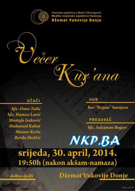 U srijedu, 30.04.2014. god., u džamiji u Donjim Vukovijama su se učile “najbolje” riječi, one kuranske, a učili su ih hafizi, profesori, poznati učači Kurana u BiH. Nakon akšam-namaza, kojeg je predvodio hfz. Sulejman ef. Bugari, Večer Kurana je otpočela učenjem sure El-Beled koju je proučila Revda Hodžić, pobjednica takmičenja u učenju Kurana (na nivou Rijaseta IZ u BiH 2013. god.) za polaznike mektebske nastave do 12 godina.