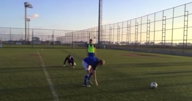 Da li je moguće izvesti penal nakon što napravite desetak krugova oko lopte držeći se jednom rukom za nju? Pogledajte u priloženom videu.