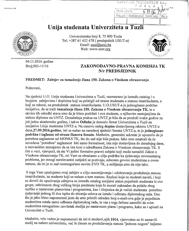 Kako se navodi u saopćenju Unije studenata Univerziteta u Tuzli, u međuvremenu je ispred ispred ove organizacije upućen zahtjev Zakonodavno-pravnoj komisiji TK-a za tumačenje člana 150. Zakona o visokom obrazovanju koji jasno govori o završetku započetih studija na Univerzitetu u Tuzli.