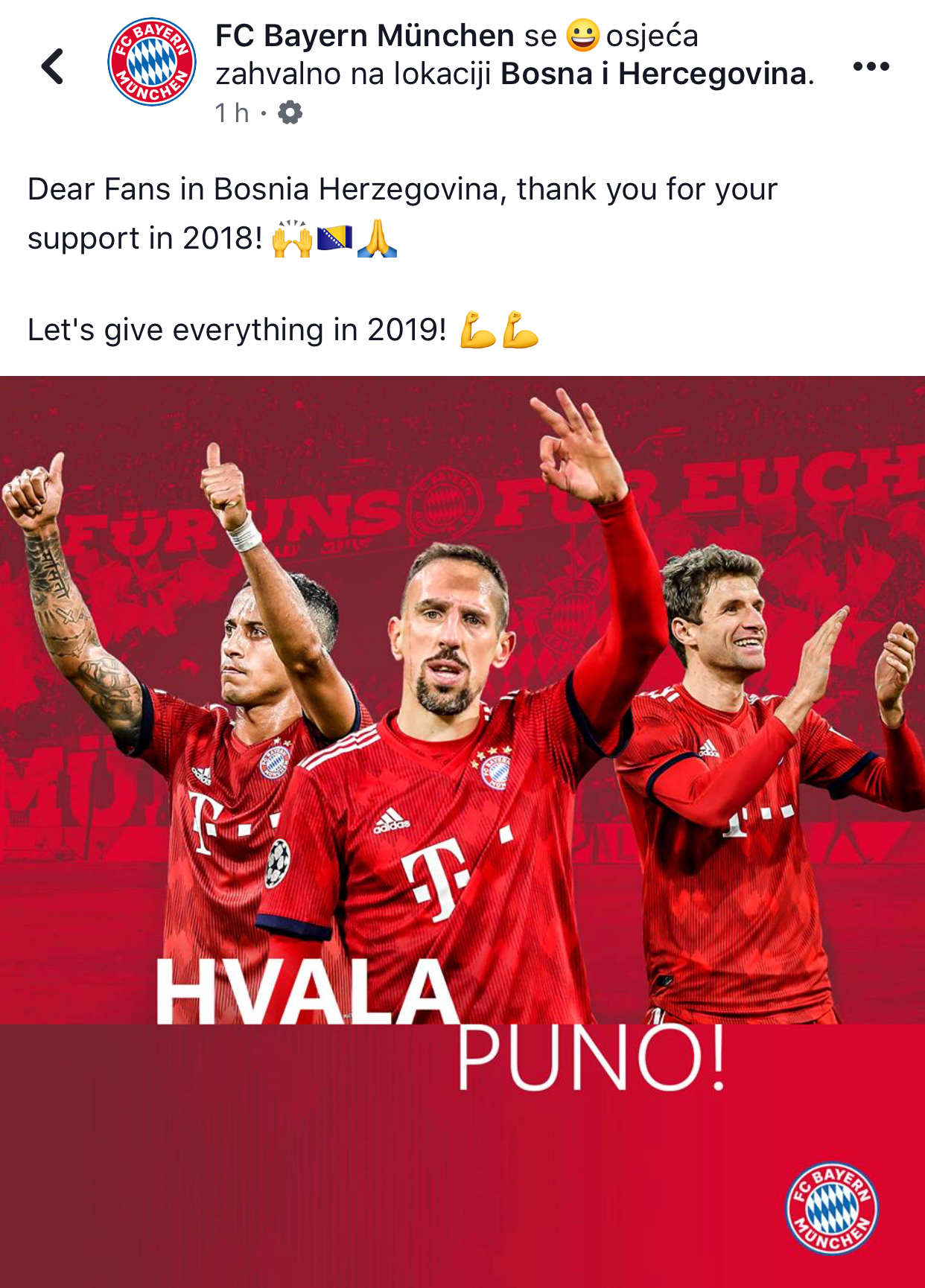 Stoga, Bayern je na zvaničnoj Facebook stranici čestitao Novu godinu fanovima u našoj zemlji te se zahvalio na podršci u 2018. uz natpis na bosanskom jeziku: Hvala puno!
