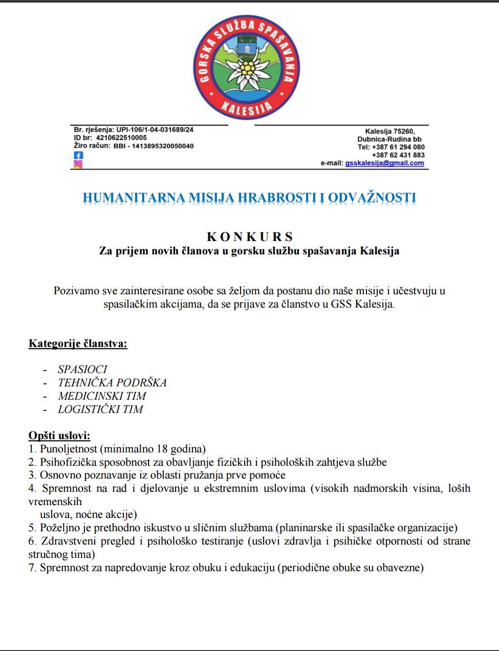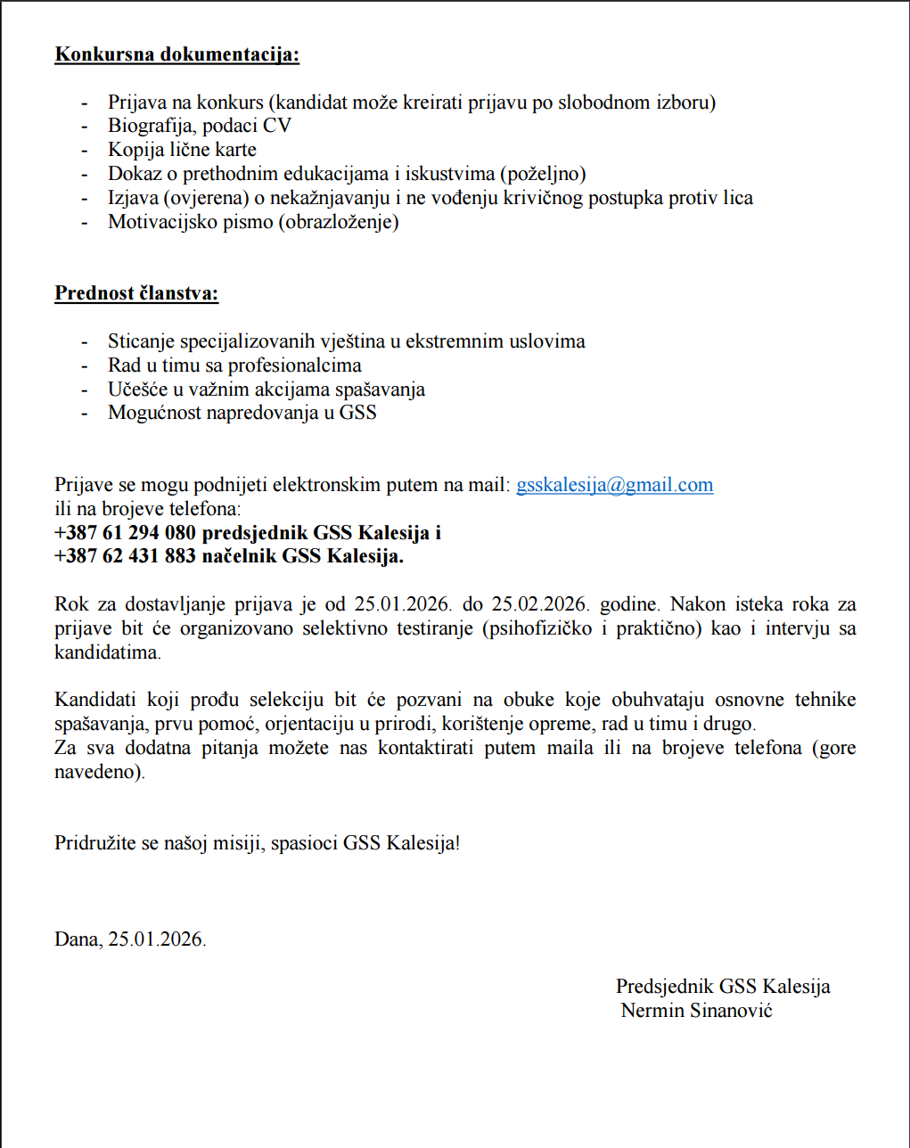 Home Bosna i Hercegovina Gorska služba spašavanja (GSS) Kalesija prima nove članove: Pogledajte uslove u Konkursu Bosna i HercegovinaKalesijaNovostiPromocijaSaopštenjaTOP TEME Gorska služba spašavanja (GSS) Kalesija prima nove članove: Pogledajte uslove u Konkursu By nkp.ba - 25. Januara 2026. 138 0 SHARE Facebook Twitter Gorska služba spašavanja Kalesija raspisala je konkurs za prijem novih članova. Prijem se vrši u četiri kategorije članstva: spasioci, tehnička podrška, medicinski tim i logistički tim. (NKP.ba)