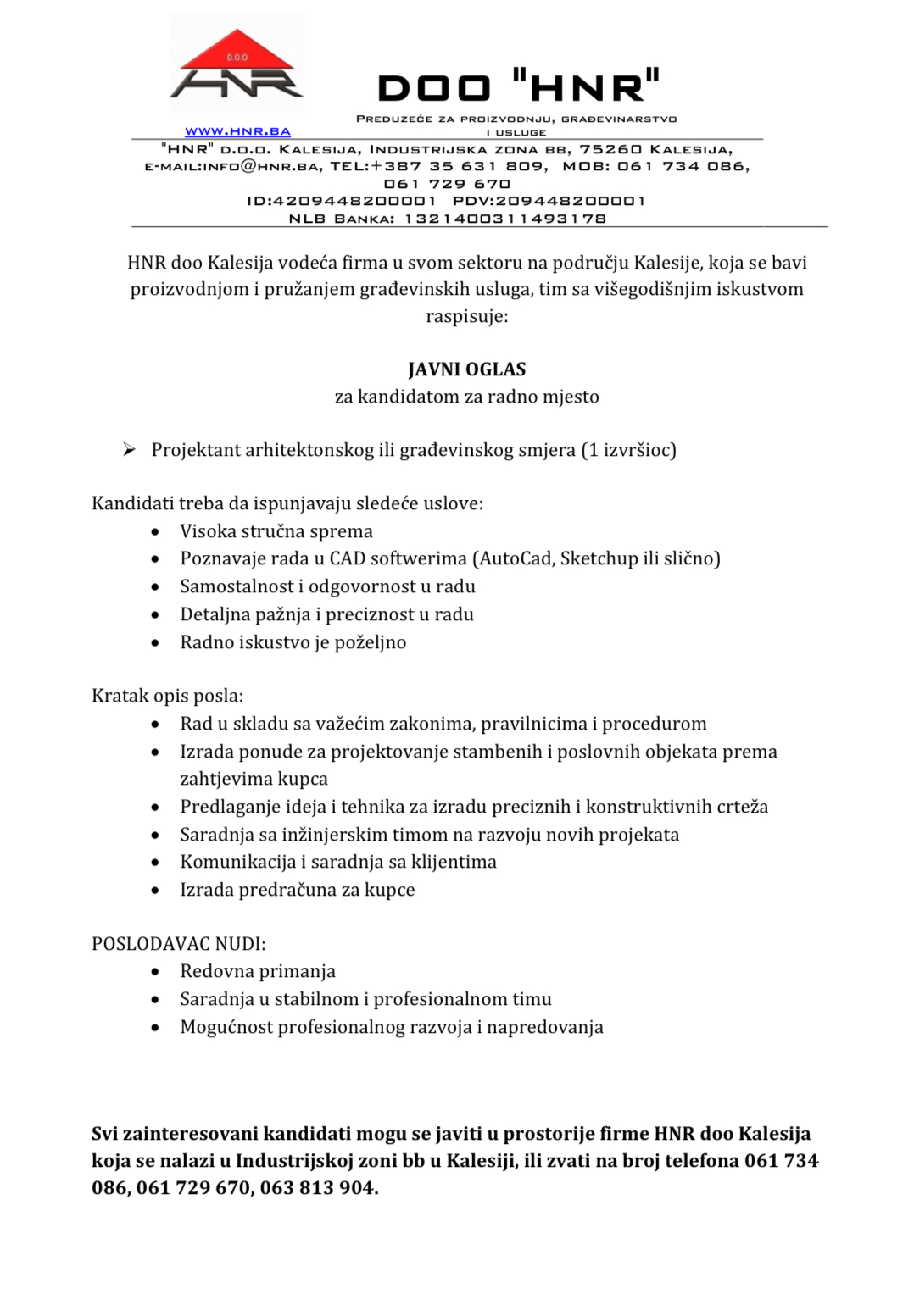 HNR d.o.o. Kalesija vodeća firma u svom sektoru na području Kalesije, koja se bavi proizvodnjom i pružanjem građevinskih usluga, tim sa višegodišnjim iskustvom raspisuje:
