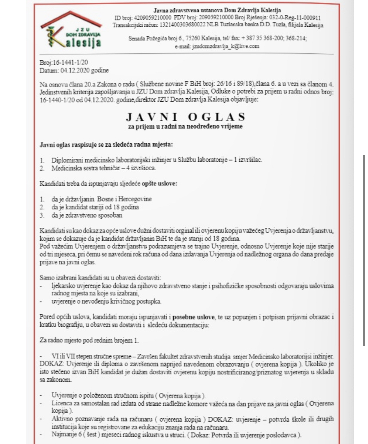 Podsjećamo, Dom zdravlja Kalesija je Javnim oglasio želio zaposliti pet radnika, i to; diplomirani medicinsko-laboratorijski inžinjer (1 izvršilac) i medicinska sestra tehničar (4 izvršioca).