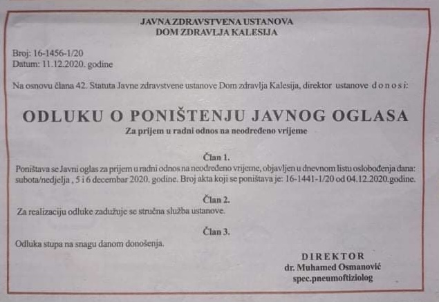 Prije nekoliko dana smo prenijeli Javni oglas za prijem pet (5) radnika u JZU Dom zdravlja Kalesija.