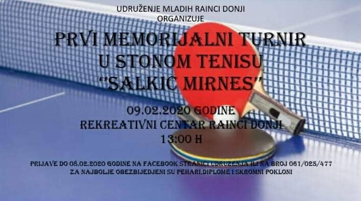 09.02.2020. (nedjelja) u Raincima Donjim će biti održan I Memorijalni turnir u stonom tenisu – rahmetli Salkić Mirnes.