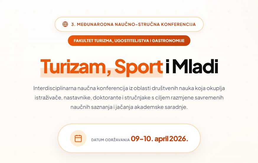 Sa zadovoljstvom najavljujemo održavanje konferencije u organizaciji Fakulteta Turizma, ugostiteljstva i gastronomije Univerziteta FINRA Tuzla, koja će se održati 09. i 10. aprila 2026. godine, s početkom u 10:00h.