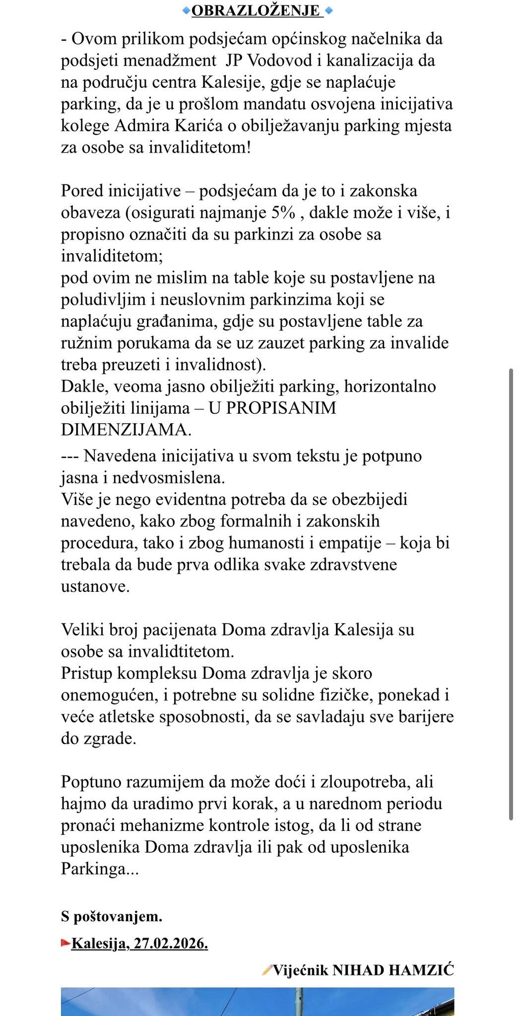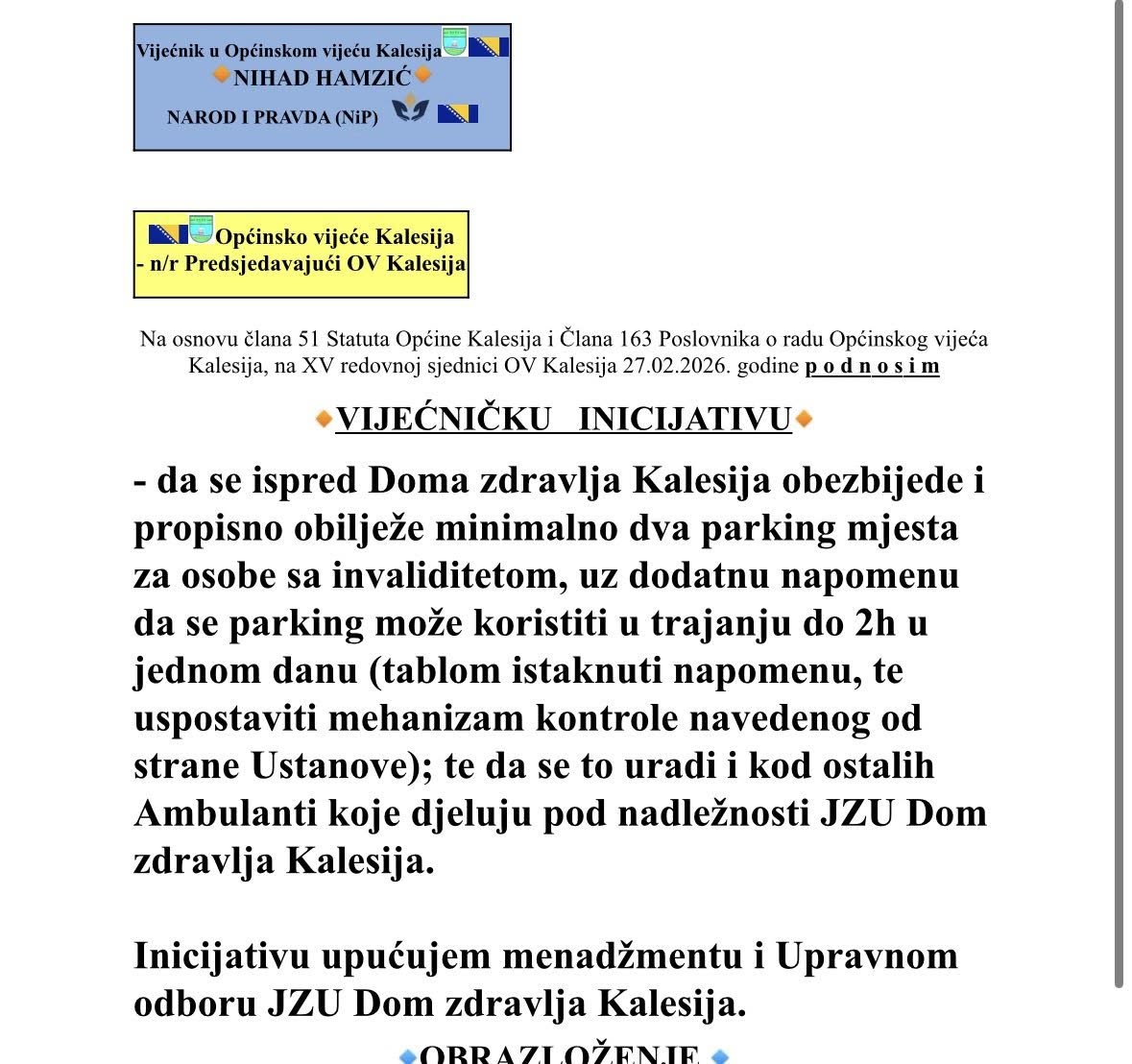 - Vijećnik Nihad Hamzić (NiP) je na 15. redovnoj sjednici Općinskog vijeća Kalesija (27.02.2026) uputio vijećnićku inicijativu – da se ispred Doma zdravlja Kalesija obezbijede i propisno obilježe minimalno dva parking mjesta za osobe sa invaliditetom, uz dodatnu napomenu da se parking može koristiti u trajanju do 2h u jednom danu (tablom istaknuti napomenu, te uspostaviti mehanizam kontrole navedenog od strane Ustanove); te da se to uradi i kod ostalih Ambulanti koje djeluju pod nadležnosti JZU Dom zdravlja Kalesija.