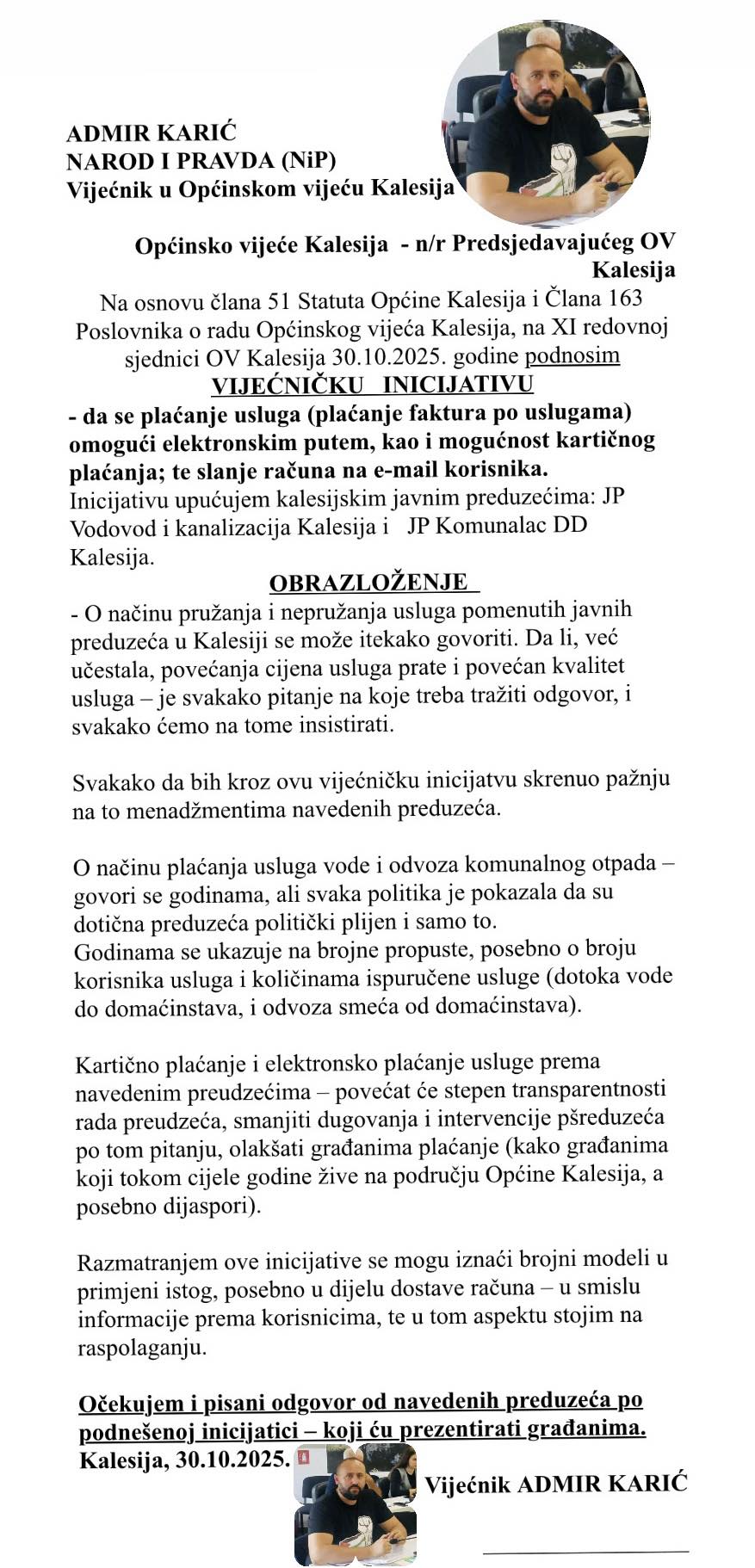 - Na XI sjednici Općinskog vijeća Kalesija vijećnik Admir Karić (NiP) je uputio inicijativu – da se plaćanje usluga (plaćanje faktura po uslugama) omogući elektronskim putem, kao i mogućnost kartičnog plaćanja; te slanja računa na e-mail korisnika.