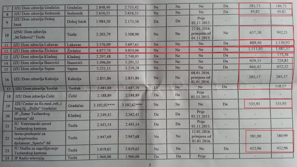 Plaću nije uskladio direktor Opće bolnice “Dr. Mustafa Beganović” iz Gračanice, te direktori domova zdravlja u Gračanici, Gradačcu, Srebreniku, Lukavcu, Živinicama, Banovićima i Sapni. Također, plaće nisu uskladili ni direktori Službe za zapošljavanje TK i Centra za fizikalnu medicinu, rehabilitaciju i banjsko liječenje “Ilidža” Gradačac.